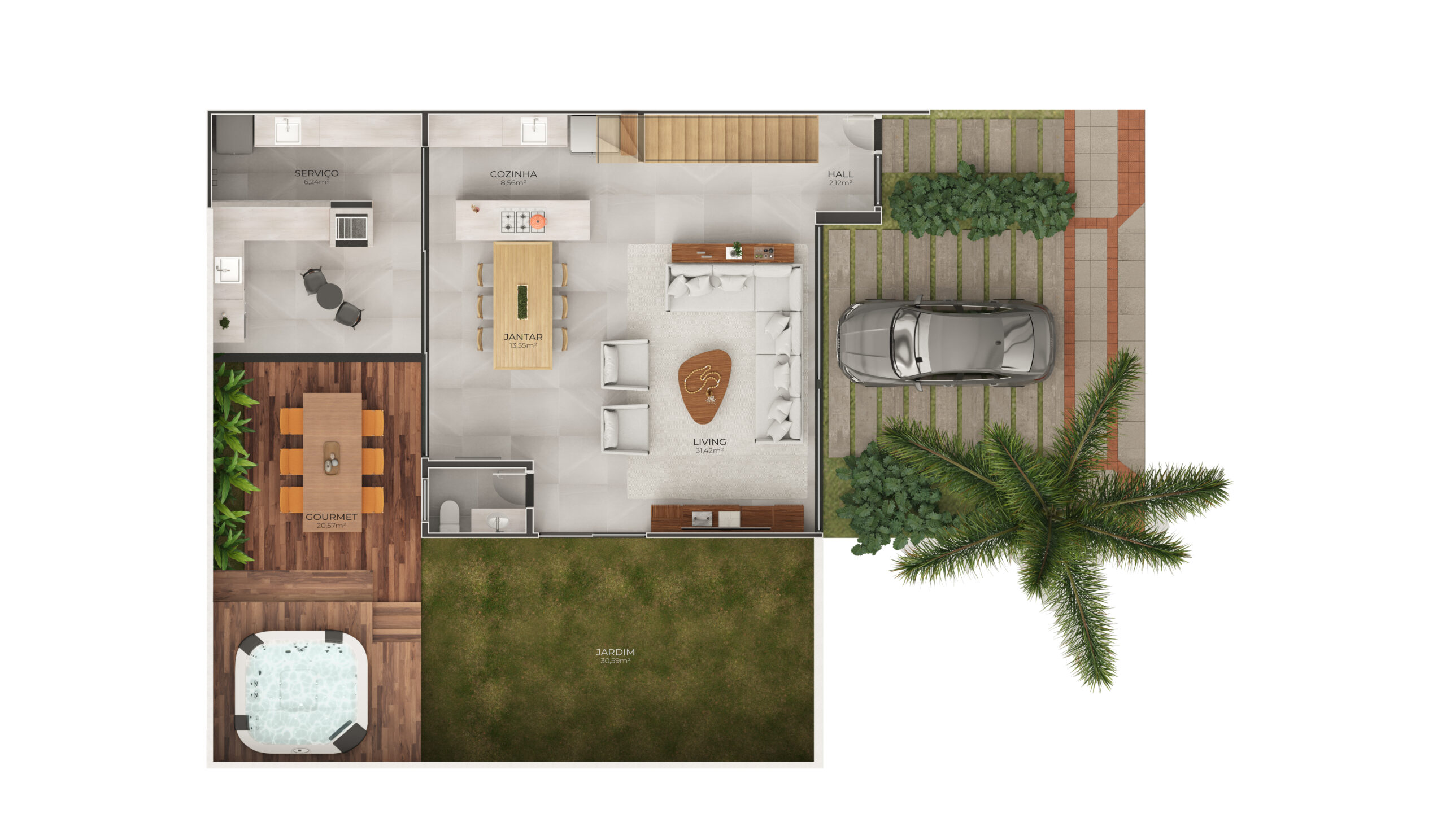 – Porcelanato em toda a casa (havendo possibilidade de trocar por vinílico no segundo pavimento)