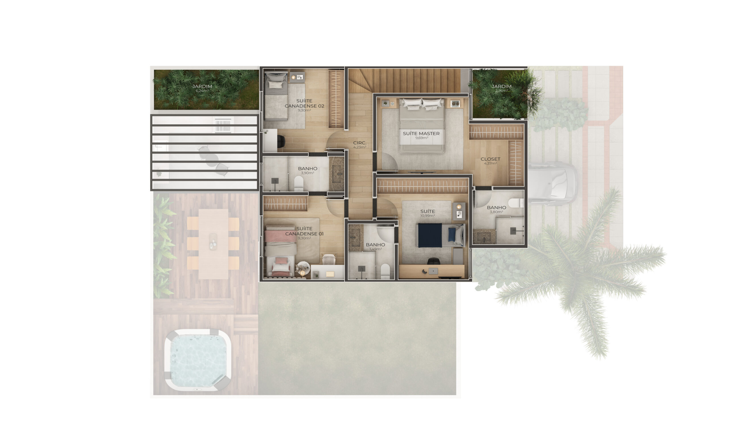 Casa modelo C (Uirapuru) : Duplex, 3 suítes no pavimento superior todas com varanda, 228,99 mts2 de área construída, 85,63 mts2 de quintal.